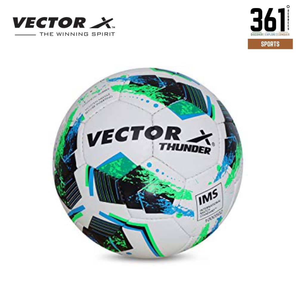 Enhance your football experience with the Vector X Thunder Hand-Stitched Football, designed for both training and match play. Its vibrant cyan, blue, and green design ensures high visibility on the field.